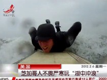 冲浪爱好者不畏严寒在冰湖中玩冲浪