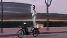 实拍超牛外卖哥站在摩托上送饭