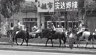 两男一女骑马闹市机动车道上行走