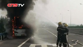郑州:赴少林寺中巴着火 瞬间剩空架
