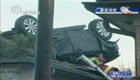 美国一汽车失控"跳"上民宅屋