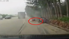 实拍货车漂移躲避车辆横扫路边摊位