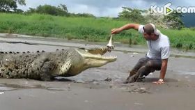 男子“调戏”巨鳄 面前“喂食”