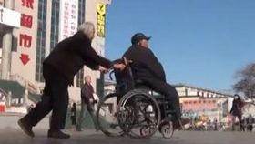 佝偻瘸腿老太推着老伴看戏