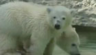 实拍北极熊双胞胎首见水池 徘徊岸边不敢下水