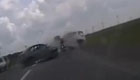 摩托躲过两车相撞夹缝逃生