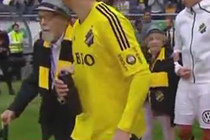 瑞典足球赛现“高龄球童” 球员搀扶入场