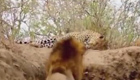 南非一雄狮偷袭小憩花豹