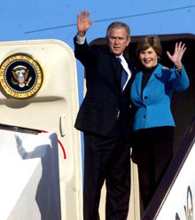 图:美国总统布什夫妇走下舷梯