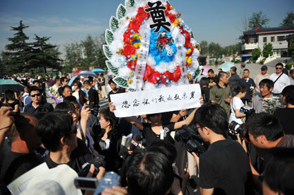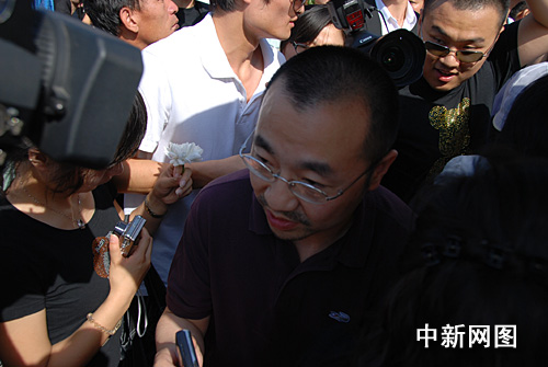 图:中国传媒大学学生手捧白花送别师兄罗京