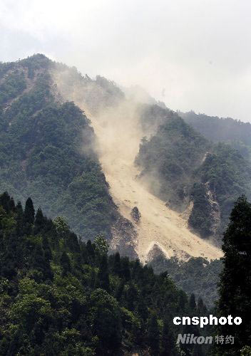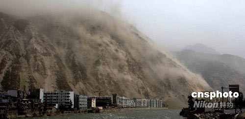 图:山体滑坡烟尘笼罩下的汶川县城