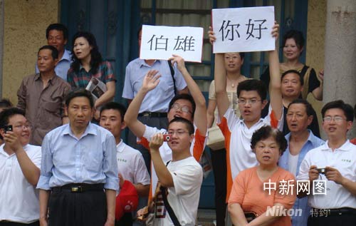 大学生在中山陵迎候吴伯雄 打出"伯雄你好"标语