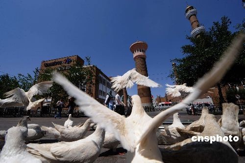 图:乌鲁木齐市民在大巴扎喂食广场鸽