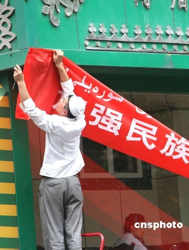 图:乌鲁木齐市一店主悬挂“民族团结”横幅