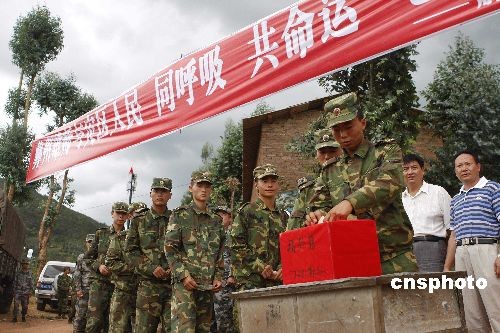 救灾官兵为云南地震灾区群众献爱心