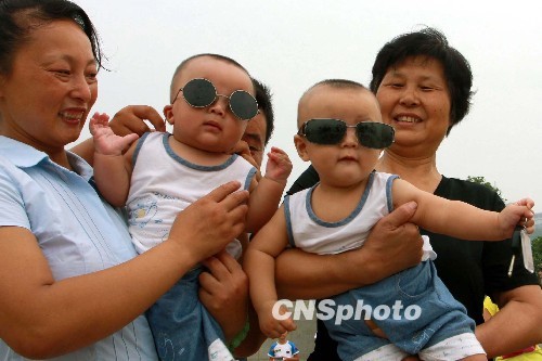 中国各地群众观看日食奇观:安徽芜湖孪生小兄弟观日食