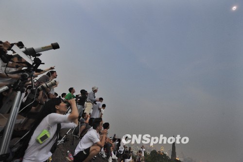 中国各地群众观看日食奇观:杭州宝石山上看日食