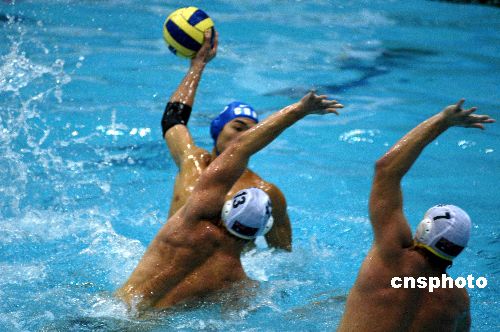 7月11日,中国队与澳大利亚队正在激烈角逐。当日晚,2006世界水球联赛男子比赛第一轮第四场在湖南永州市体育中心进行,中国队不敌澳大利亚队,最后以5:9的比分败北。中新社发 席晓刚 摄