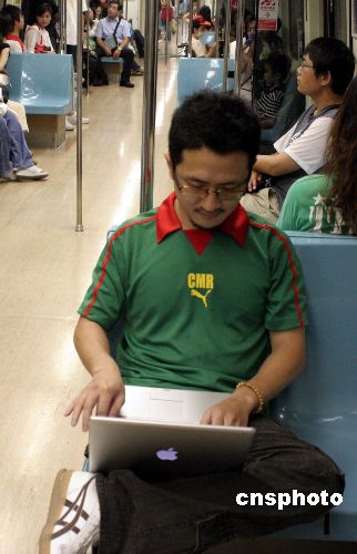七月九日,台湾“故事之王”、当红网络作家九把刀正在台北地铁里写小说。九把刀原名柯景腾,又号网络文学经典制造机,二000年出版第一本网络小说《恐惧炸弹》后便一发不可收拾,至今已出版了三十余本网络小说,其中在大陆发行的有八本。他的一本《功夫》深受大陆年轻人欢迎,曾流传“上世纪读痞子蔡,新世纪读九把刀。”中新社发 邹辉 摄