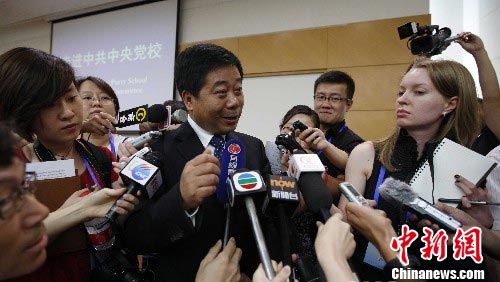 图为中共中央党校副校长陈宝生向记者介绍党校情况,并回答记者提问。中新社发 盛佳鹏 摄