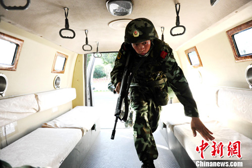 7月2日下午,武警驻新疆维吾尔自治区某部战士登上运兵车,进行机动性训练。中新社发 侯宇 摄