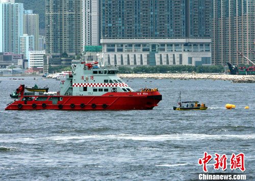 7月3日,香港一架前往澳门的直升机,中午在上环信德中心对开坠海,全部13人获救。水警轮和飞行服务队直升机在现场搜索。有目击者说,听到直升机起飞传出巨响,机上随即有杂物飞出,直升机慢慢堕海,并浮在海面,由一些浮泡承托,无即时翻沉。中新社发 洪少葵 摄