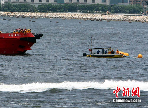 7月3日,一架由香港前往澳门的直升机,中午在上环信德中心对开海面堕海,机上13人全部获救。出事的直升机属于空中快线公司,机上载有两名机组人员及11名乘客。中新社发 洪少葵 摄