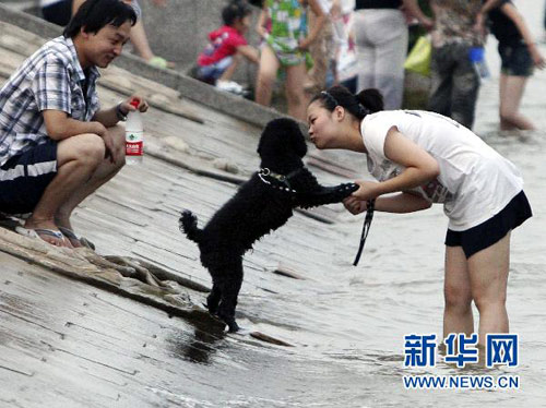 7月3日傍晚,湖北武汉市民带着宠物狗在汉口江滩公园戏水消暑。金思柳 摄