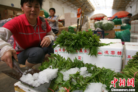 7月5日,北京新发地蔬菜批发市场的菜商为蔬菜敷上冰块降温保鲜。近日连续高温使得蔬菜极不易储存,为保证蔬菜新鲜,商户将冰碾成碎末,分装成冰袋放入蔬菜包装中。新发地市场蔬菜交易区一天就能使用800顿冰块保存蔬菜。根据最新气象分析,从7月2日开始的高温,将持续至7月7日,连续高温日数长达6天,将创近10年7月上旬同期最长高温日纪录。中新社发 苏丹 摄