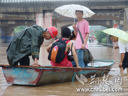 据县气象部门介绍,该县城区上午11时至下午月15时的降雨量为80.毫米,暴雨导致该县新城区府东路、东洪花路、罗马街和松竹街部分街道积水,部分街道淹水深达半米。暴雨导致该县新老城区交通中断,有市民竟然在积水的涵洞边撑船渡客。(宋俊初 徐胜桥)