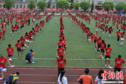 7月10日上午,在吉林省延边朝鲜族自治州,一场名为“快乐足球世界之巅”的大型颠球活动精彩上演。1062名来自吉林省各地的球迷,用除了手和胳膊之外的身份部位连续颠球10秒以上,成功打破了此前由匈牙利人创造的792人世界吉尼斯颠球纪录。中新社发 金倩 摄