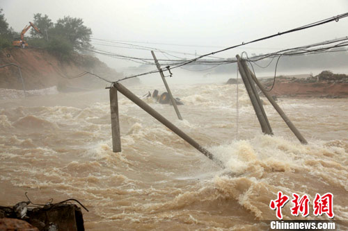 7月8日至12日,安徽省南部出现十年来最强一次集中强降水过程。初步统计受灾人口244.9万人,紧急转移安置1.77万人;农作物受灾面176.6万亩,倒塌民房2155间,直接经济损失5.86亿元。10日至12日,安徽省桐城市大沙河流域上游普降特大暴雨,因暴雨形成山洪造成河堤漫顶导致该市受灾人口11.2万人,紧急转移安置人口4200人,农作物受灾面积6333公顷。图为大沙河决堤后被冲垮的电线杆。中新社发 张娅子 摄