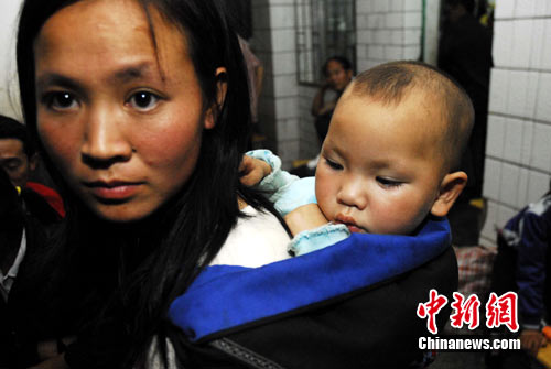 图为临时安置点内一位母亲正在安慰久久不能入睡的孩子。中新社发 田洪 摄