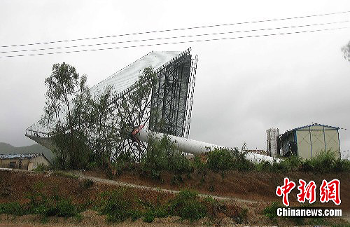 台风“康森”7月16日晚19时50分在海南三亚亚龙湾登陆,中心最大风力12级。图为与三亚相邻的陵水县高速公路旁一大型广告牌被大风吹倒。中新社发 吴天军 摄