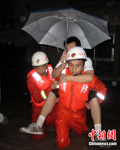 7月18日,四川省达州市渠县持续降暴雨,水位急速上涨,县城部分地方突遭洪水袭击。图为两名消防官兵正在紧急转移受伤民众。中新社发 张勇 摄