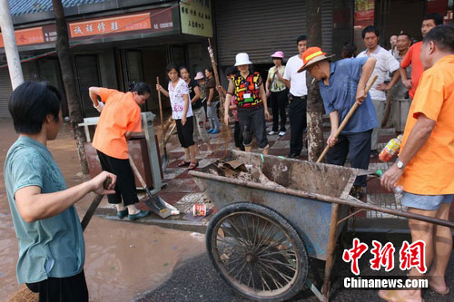 图:四川广安万人洪峰后忙清淤消毒(4)