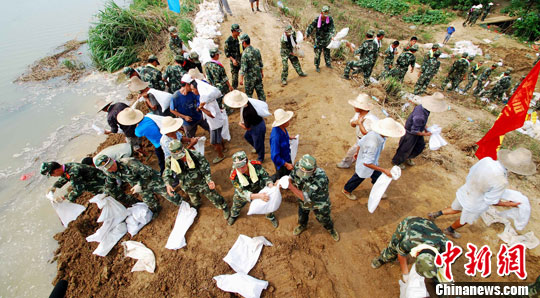 险情发生后,武警水电二总队的官兵与当地群众冒着大雨合力奋战,在出现险情的圩堤上进行堵漏防渗,有效地防止溃堤的发生。