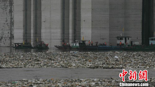 7月20日8时,三峡工程建成来最大洪峰抵达了三峡大坝,也带来了上游许多漂浮物。图为洪峰过后工作人员在大坝前清漂,防止漂浮物对发电、航运产生影响。中新社发 刘良伟 摄