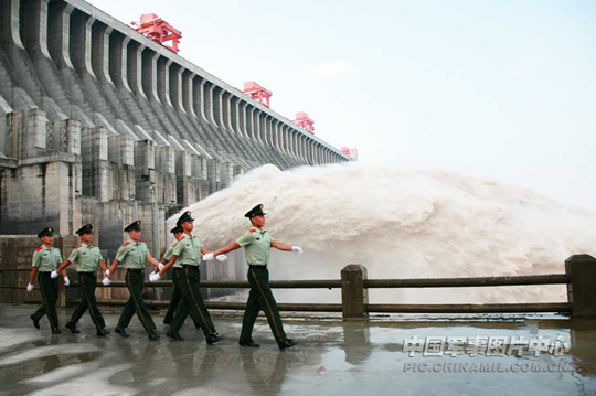 7月20日,百年一遇的特大洪峰经过三峡大坝,入库流量超过7万立方米每秒,规模超过98年最大洪峰,为三峡大坝建坝以来面临的最为严峻的考验。关键时刻,驻守三峡大坝的武警宜昌市支队官兵全力加强水面、陆路执勤、巡逻力度,出动世界最大清漂船不间断清除水面漂浮物,严把各处关卡,同心协力,严防死守,与大坝一同经受住了最大洪峰的考验。 李开勇 胡睿 摄