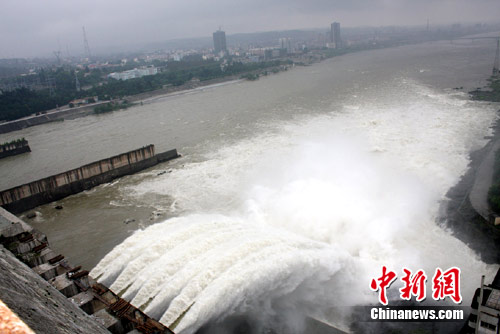 7月22日13时24分,南水北调中线丹江口大坝开启了31个泄洪孔中的4个深孔泄洪。这是丹江口大坝主体工程全线贯通以来首次开闸泄洪。考虑未来还有一场降雨,长江防总于22日11时50分下达指令,要求丹江口大坝泄洪。此次泄洪为下一次洪水的到来腾出了库容,确保安全度汛。中新社发 陈攀霄 摄