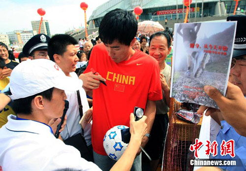 7月22日,“全民健身志愿服务——奥运冠军、优秀运动员走进新疆”活动启动仪式在新疆体育中心举行,活动现场“飞人”刘翔被热情的新疆民众“包围”索取签名。 中新社记者 刘新摄