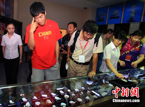 “飞人”刘翔在参观新疆博物馆时,格外关注展馆内的和田玉展柜。中新社记者 刘新摄