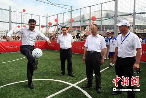 7月22日,“全民健身志愿服务——奥运冠军、优秀运动员走进新疆”活动启动仪式在新疆体育中心举行,陪同国家体育总局局长刘鹏(右二)出席此次活动的新疆维吾尔自治区主席努尔·白克力在足球场上展示技艺。中新社记者 刘新摄