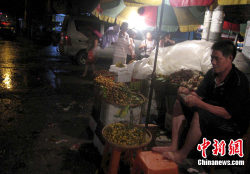 7月22日晚间,广西北海市富贵路夜市数家“生意比台风要紧”的排档和水果摊,冒着今年第3号台风“灿都”带来的风雨坚持营业。中新社发 冯抒敏 摄