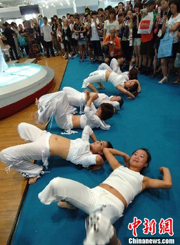 7月23日,以展示国际先进健身器材特色的“2010中国国际健身大会”在北京国家会议中心开幕。图为来自亚洲健康事业商学院的健美培训师们为观众表演普拉提。中新社发 邹宪 摄