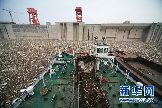 组图:三峡最大洪峰过后清漂忙(3)