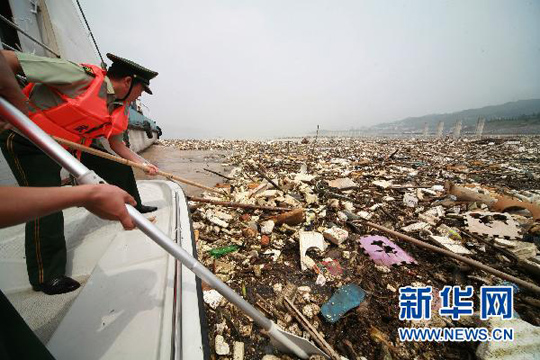 7月23日,武警湖北宜昌市支队官兵在三峡大坝上游禁航区清理漂浮物。李开勇 摄