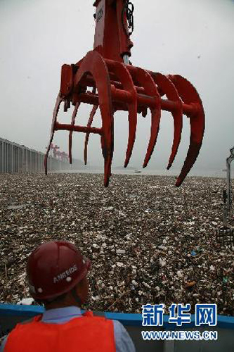 7月23日,清漂人员在三峡大坝上游禁航区清理水面上的漂浮物。李开勇 摄