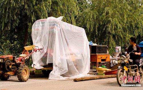 7月26日,河南淅川县民众开着用手扶拖拉机自制的“房车”驻扎在马路上躲避洪水袭击。连日来,受强对流天气的影响,强降雨席卷了河南13市70多个县市、区,部分地区通讯中断。由于降雨过程来势迅猛、强度大、时间相对集中,致使山区山洪暴发,部分河流水位猛涨,引发了严重的洪涝灾害。中新社发 王中举 摄
