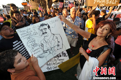 当地时间7月26日傍晚,加州贝尔市近千名市民聚集在市政厅门前,抗议该市官员领取六位数年薪,要求市长和市议员辞职。中新社发 张炜 摄